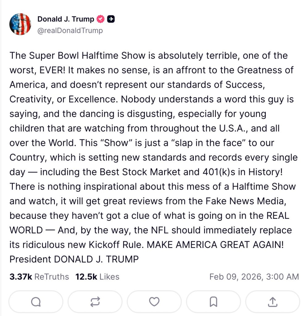 I en protest bestämde sig Turning Point USA, organisationen som tidigare leddes av Charlie Kirk, för att skapa en alternativ halvtidsshow. Den amerikanska högern har under Trumps ledning spridit både alternativa fakta och alternativa nyheter, så sett till det stora hela är väl en alternativ show ett tämligen milt steg i marknadsföringslinjen. Det som dock behöver påtalas är den uppenbara ironin i att programmet, som menar sig ta avstånd från NFL:s påstådda politisering av såväl sporten som konsten, inleds med ett uttalande av USA:s tidigare försvarsminister, numera krigsminister, Pete Hegseth.