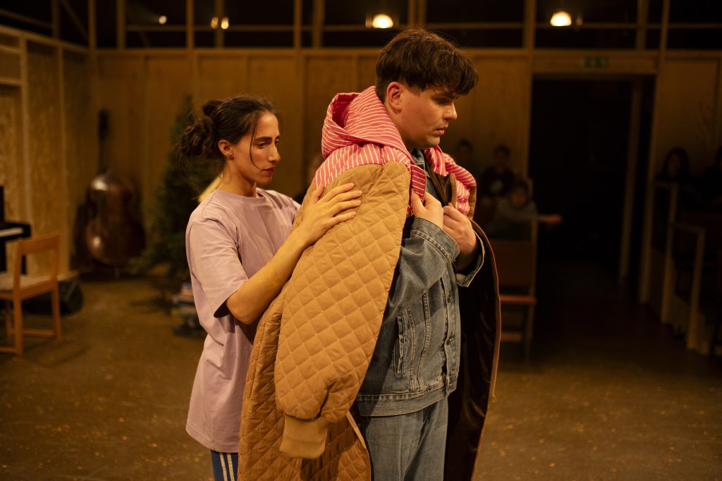 Under hela föreställningen vrider publiken på sig av nyfikenhet över vad som händer i rummet, och pekande fingrar följer skådespelarna som klättrar upp på träbygget och fortsätter spela diagonalt över Jenny Kronbergs scenografi. Det är otroligt effektfullt att lyfta scenen på det sättet, men dialogen riskerar försvinna i publikläktarnas stim. Det blir ibland svårt att hålla fokus på spelet när ljuset är helt tänt och det är lika spännande att titta på klasskompisen mittemot. Kanske hade fokuset skärpts om föreställningens form var mer immersiv? Sällan skiftar jag fokus så här mycket under en föreställning – något man nog gärna hade besparat de unga Tiktok-hjärnorna.