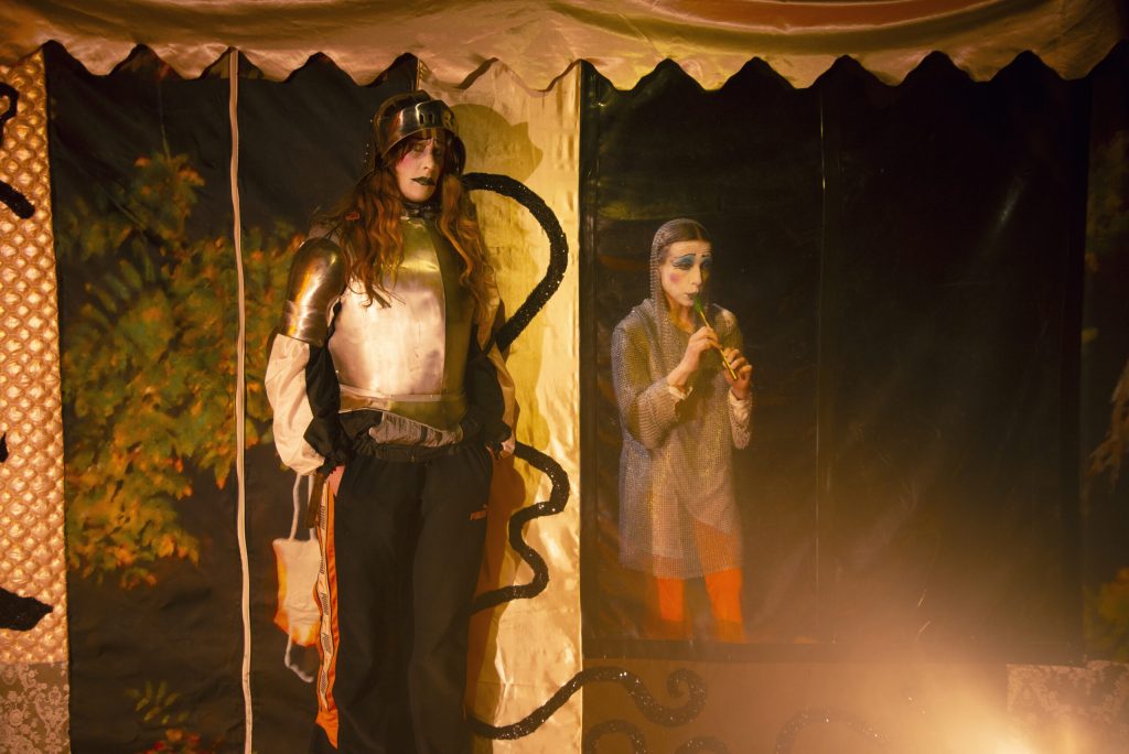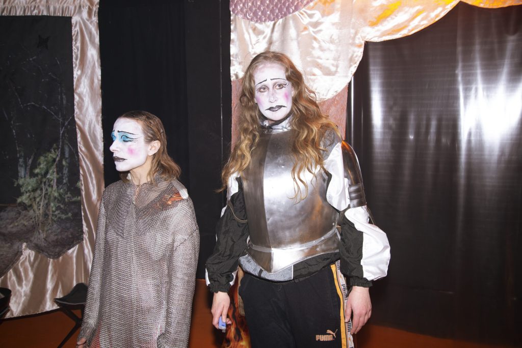 – Kristina säger att pjäsen inte handlar om sport, det handlar om känslor och ett tillstånd. Den här bilden som vi jobbar med, den med riddare är ju en sorts metafor för det tillståndet de befinner sig i, men också när jag ser Jenny och Janna som kämpar med sina riddarrustningar, att det är vi som just nu kämpar oss igenom pjäsen men också livet. Som att man går runt med en rustning, när allt som händer i världen är kaos. Att man går runt och försöker se normal ut, medan man har en rustning på sig. Det känns lite som pjäsens själ, man låtsas att man har koll på läget när man egentligen har en existentiell kris.