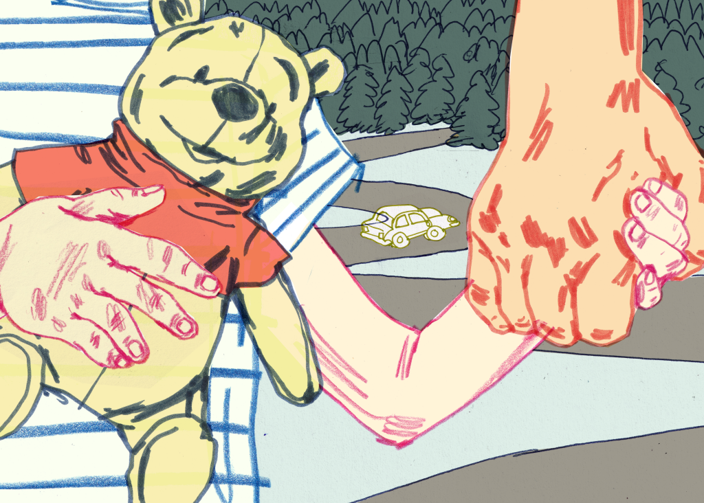 Hon ligger på golvet i köket och spelar schack med Nalle Puh, han sitter med hakan mot bröstet och förlorar. Morfar står på altanen och lutar sig mot räcket, han tittar ut över sjön, på det blåa som krusar sig över djupet, på en båt som snittar ytan med sina motorvingar. Hon vet vad morfar tänker när han står där, hon kan se när han befinner sig bortom uppmärksamheten, hans hållning är så mjuk då och andningen så stor, hela magen expanderar. Hon får inte plats i de stunderna och det ska vara så, det är i sin ordning.