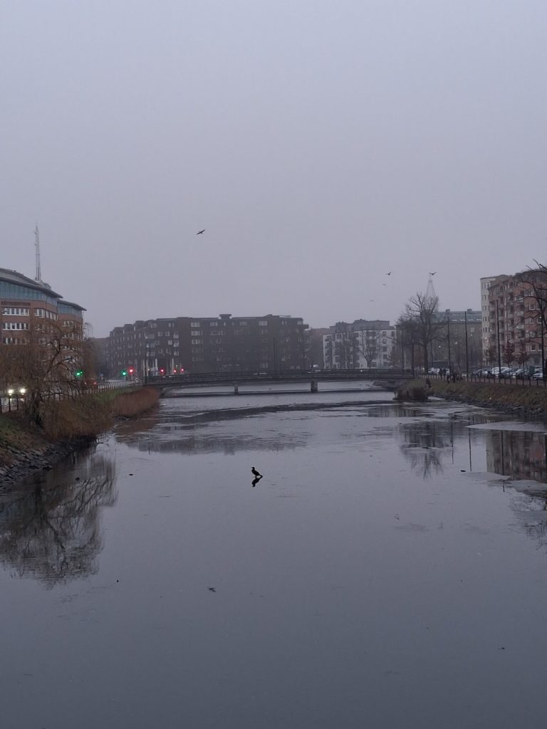 Något liknande vill jag säga om Malmö, eller helt enkelt travestera: Skymningen som grus över kanalens is. Det är ett grått land, ett ljus med handskar av gräsandsdun.