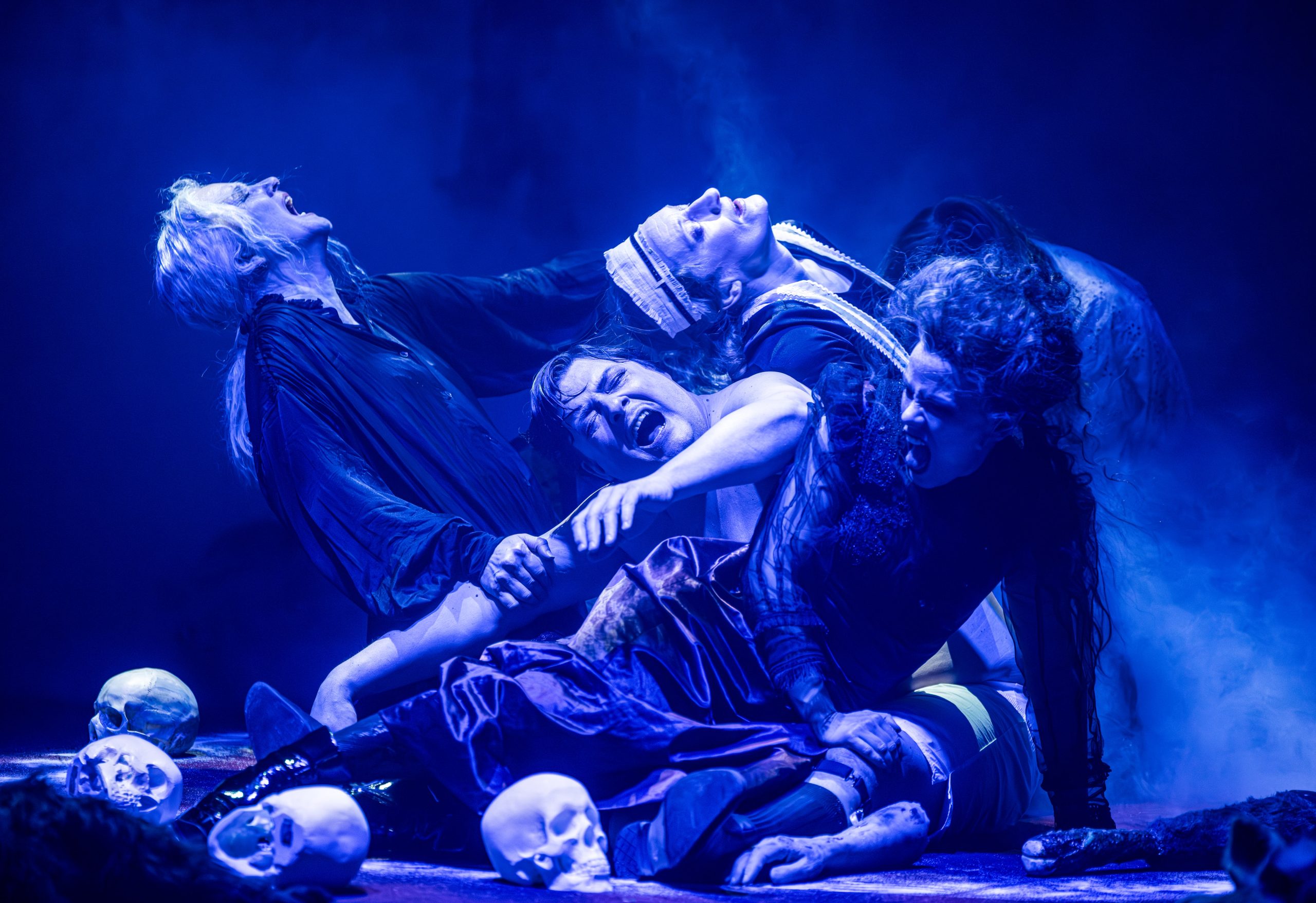 Till en av de mer kontroversiella scenerna i pjäsen hör djävuls-orgien – en ritual då ensemblen låter ben och armar trasslar in sig och kropparna bli djuriskt beroende av varandra. Självklart krystas det fram magiska kulor ur kvinnokön – efter fjolårets ägg på Folkteatern kan man med Elin Skarin på scen knappast bli förvånad.