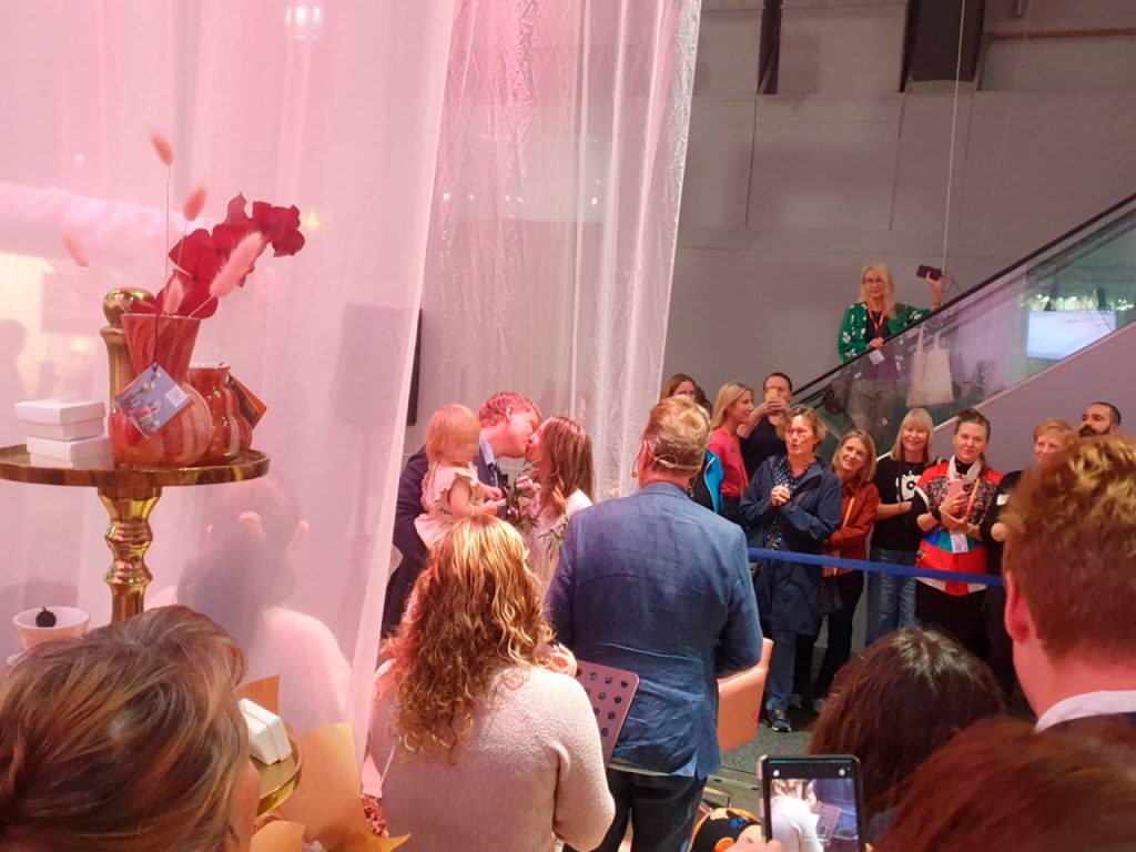 Det är lördag förmiddag. I väntan på en intervju med Maria Maunsbach lyssnar jag på hennes och Anders Cullheds samtal om kärlekens kraft, kropp och kaos. Maria berättar om hur hennes huvudkaraktär Jenny tänder på (och längtar efter) ett “för evigt” med sin partner. Passande nog dränks Maunsbach “för evigt”-replik av hög och plötslig orgelmusik när Björn Ranelid börjar viga par precis bredvid. Brud och brudgum skrider ner för rulltrappan och ställer sig med vit långklänning, frack och pampigt stor bukett på den bubbelgumsrosa heltäckningsmattan som breder ut sig över kärleksscenen. Tatueringen tittar fram på bröstet mellan uppknäppta skjortknappar medan Ranelid säger några ord om kärlekens styrka. När vigseln är över spelar några Rytmus-elever en cover på Kents ”Utan dina andetag”. Smörigt piano och stämsång fyller kärleksscenen och mitt på mässgolvet, bland 30 personer som filmar och tar selfies framför ett okänt par känns allt märkligt surrealistiskt.