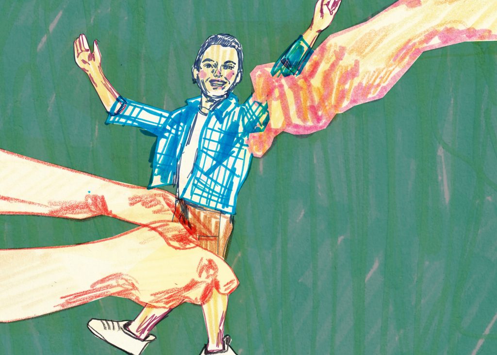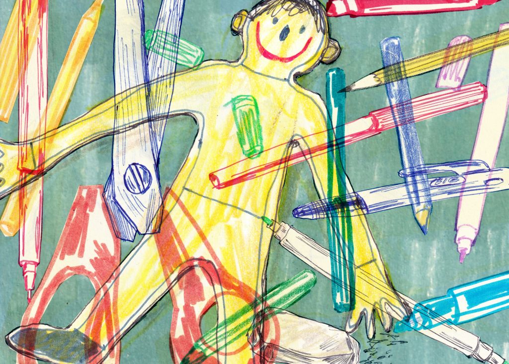 Han sitter koncentrerat på golvet i vardagsrummet. Runt honom brer ett hav av det pyssel han fått av mamma ut sig. Det glittrar av färgglada pappersbitar och locklösa pennor. I mitten sitter han med en sax som är nästan lika stor som han själv i ena handen, i den andra håller han sitt verk. Han biter sig i läppen medan han snyggar till kanterna, han kan knappt vänta tills den är färdig men först måste han se till att den blir perfekt. Varsamt klipps simhuden i papp mellan fingrar och tår bort. Han suddar bort blyertsresterna under de färdiga tuschlinjerna. Tålmodigt har han väntat så att färgen hunnit torka innan han börjar sudda, så att inga linjer blir förstörda. Han har målat munnen oproportionerligt stor och osannolikt glad. Men det fina i att bygga sin egen är att man får välja själv. Och får han välja själv ska hans vara gladast och snällast i världen. Mungiporna slutar uppe vid öronen och de är målade i röd permanent tusch så att de omöjligt kan halka ner. Alltid glad. Aldrig arg. Även armarna är oproportionerligt långa, det är för att hans alltid ska kunna kramas, även om han har en annan under armen med. Armarna är tillräckligt långa för att alltid rymma honom. Händerna däremot har han krympt, det är av taktiska skäl, så att de inte kan nå runt hans handleder. Det kan göra ont när de har för stora händer, och har man chansen att konstruera sin egen bör man tänka på sånt. Han ser sig om i pennhavet och funderar en stund innan han slutligen greppar en. Så färglägger han hela kroppen, både hud och kläder, i gult. För det är en snäll färg, en varm och skön färg som utstrålar värme, det har bildläraren sagt och får man välja färg på sin ska hans vara gul. När han är klar har även hans egna fingrar färgats aningen gula av all tusch som använts, men det gör ingenting. Det får det bara att kännas som att de hör ihop. Att de som nästan är släkt på riktigt. Han ler stort och springer ut i köket.