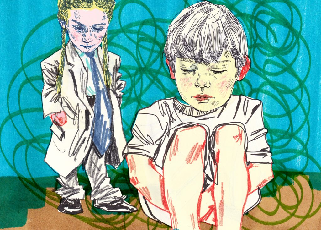 Han är en kille, så därför stönas och suckas och sparkas det grus även från hans håll så fort förslaget kommer. Det är bäst att göra som resten av killarna, att sticka ut är inte riktigt hans grej. Men i hemlighet hoppas han alltid att förslaget ska gå igenom. Och rätt så ofta efter en omgång gruskrig vinner tjejerna och killarna går motvilligt med på att ingå i världens mest tjejiga lek. När förslaget klubbats igenom kastar han huvudet bakåt och suckar högt, men ler inombords när han och resten ställer upp sig för att bli tilldelad sina roller i leken. Mamma och Pappa paxas snabbt. Det är alltid samma två tjejer som spelar den grunden. Resterande tjejer bråkar om vilka som får vara storasyster. Som kille ber man aldrig om att vara någon speciell, man blir allt som oftast store- eller lillebror, vilken av dem beror för enkelhetens skull på längd. Han tar som alltid emot lillebrorsrollen med ännu ett stön, innan han går in i karaktär. Men då trivs han. Det är underbart. Det spelar ingen roll att han blev lillebror, han hade lika gärna kunnat få bli lillasyster. Så länge han får leka barn är allt perfekt. Han leker barn med två föräldrar. Han tittar på sin pappa med långa blonda flätor och rosa gummistövlar, världens bästa pappa, tänker han. Han kryper runt på alla fyra och säger gogo gaga medan mamman och pappan står och lagar geggamojagryta. Min pappa har två flätor. Ansiktet är vänt ned mot marken, det är bara han och gruset som vet att han ler.