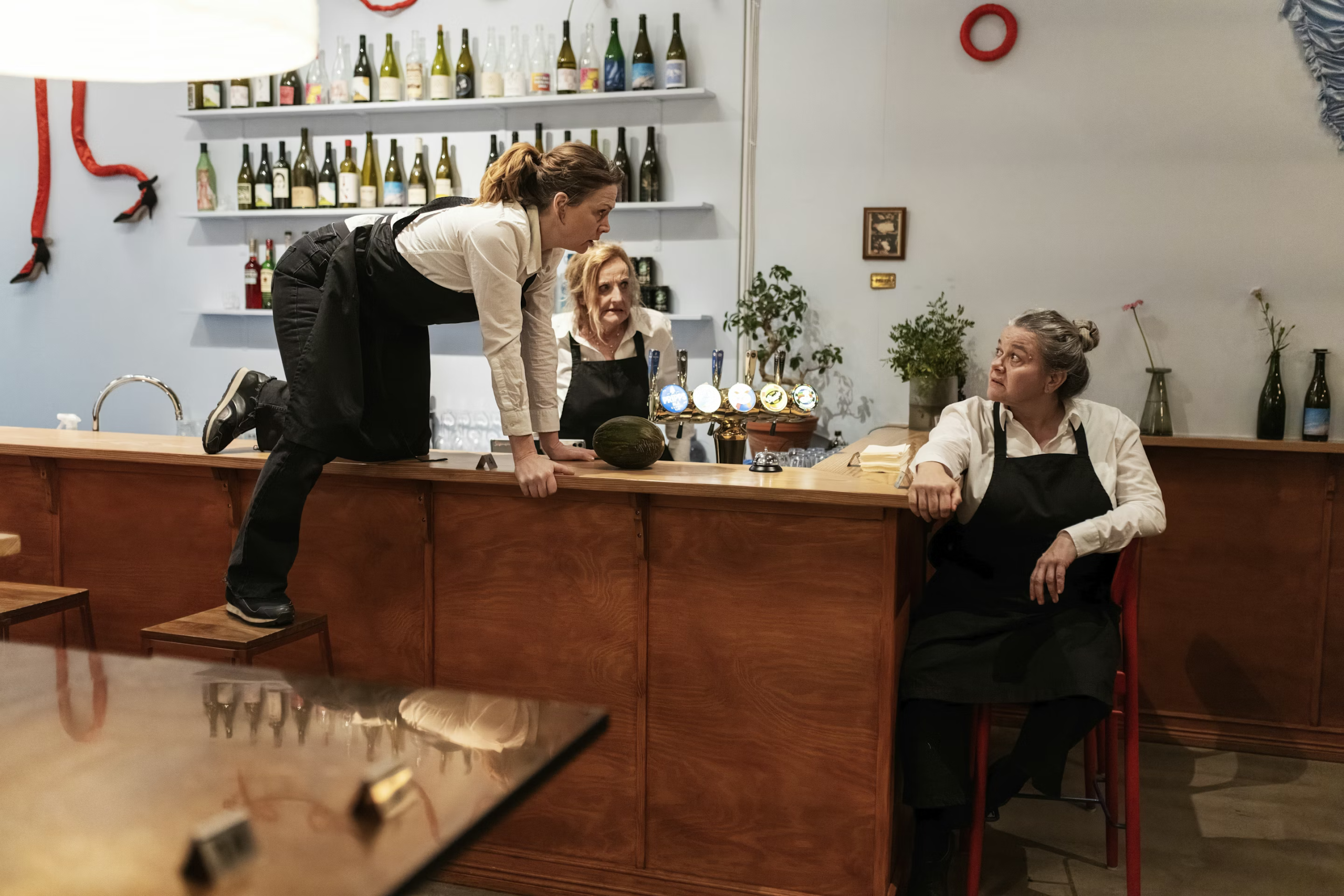 I akt två placeras vi vid borden på den inglasade serveringen på Folk och bjuds på en cocktail av femton historiska scener vars gemensamma nämnare är att de alla gestaltar kvinnor som dör. Fröken Julie, Medea, Madame Bovary, Hamlet och Anna Karenina för att nämna ett fåtal levereras i rasande fart mellan barborden. “Dog hon!?” är frågan som uppstår mellan scenbytena – PING – så slås det i en receptionsklocka och svaret är ja. Akten blir tragikomisk, sann gentemot teaterhistorien och kommer samtidigt skrämmande nära dagens nyhetsflöden.