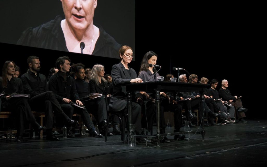 Så istället för att bedöma föreställningens komponenter, såsom den katarsiska klagosången som får inrama vittnesmålen, de alltigenom välformulerade och tillräckligt koncisa rättegångscitaten (med strålande översättning), eller ensemblens vansinnigt generösa läsningar, kan vi istället fråga oss vad scenkonstens funktion egentligen är? En vansklig fråga kan tyckas, men vi gör ett försök.
