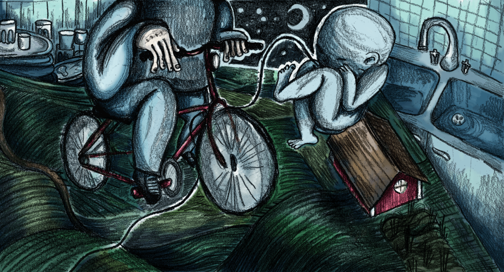 Ett rött hus med vita knutar, ett kneg, några barn och ett trädgårdsland. Kan inte det räcka som en dröm. Kan vi inte vara klara med att “bli något”? Det skulle vara så jävla skönt att bara ge upp och kramas. Baka ett bröd eller två. Målet för mig ser ut så att jag som vuxen har många vänner. Att barnen är med. Att man kan sitta runt ett bord och snacka och äta och spela spel i jättemånga timmar. Man har människor (plural) att ringa när det krisar. Man lyfter varandra. Kanske prioriterar sina barn framför att jobba nio timmar om dagen. Håller om varandra hårt och länge och inser att det är det viktigaste. Bär varandras kryckor.