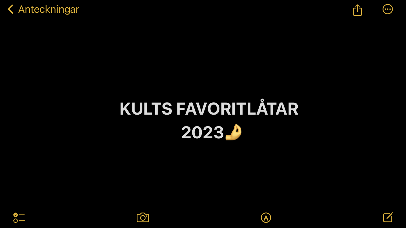 Så var den här igen! Inte julen, inte det stundande nya året – utan perioden då vi sammanfattar musikåret som passerat. Vi älskar listor, vi älskar musik, och vi älskar er, våra kära läsare. Inte mer än rätt att vi då ger er våra bästa låtar från 2023! Kanske vill du hitta ny musik att ta med dig in i 2024, vässa din musikkoll så du kan krossa musikquizet som nån musiknördig kompis med all säkerhet kommer dra upp på nyårsafton, eller bara är nyfiken på vad som kvalat in på våra listor.