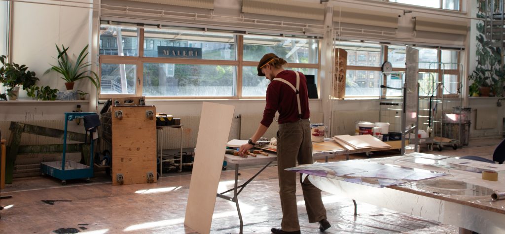 I målarateljén under GöteborgsOperans solvarma takåsar står scenografen Axel Boberg Ragnerstam med blyertspennan redo bakom örat. Han pekar mot en nymålad bräda som precis blivit av med sin naturliga träådring. Den ska bli gungbräda i vårens produktion Skuggbarnet på GöteborgsOperans lilla scen. Axel är ansvarig för produktionens scenografidesign och nästa steg för kollegorna i måleriet är att gå in med “träådringsmåleri” för att få brädan att se naturlig ut igen.