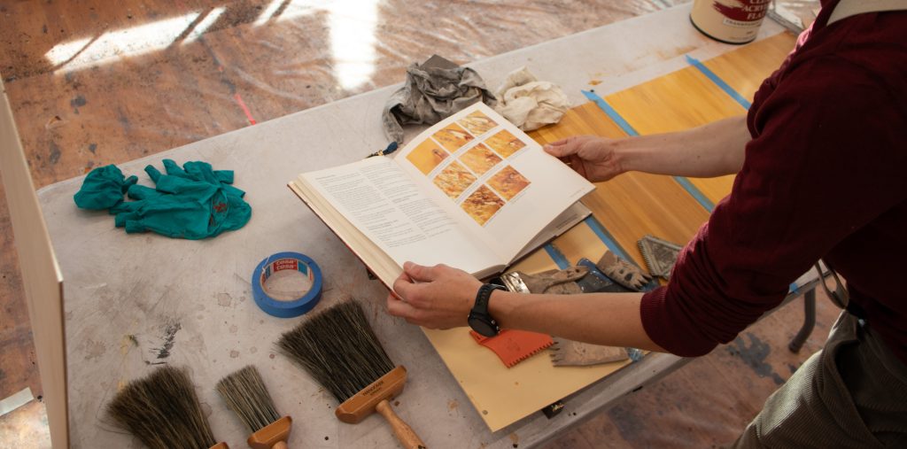 –Teaterkonsten och filmkonsten kan upplevas lika men det är också två olika sätt att se saker på. Något som i film sticker ut på ett vis ger sällan liknande effekt på en teaterscen. Man måste vara starkare i vissa kontraster för att nå 20 meter bort än att nå en halvmeter bort till en kameralins, säger Axel och visar upp de speciella penslarna som strax ska ge plankan ny färg.