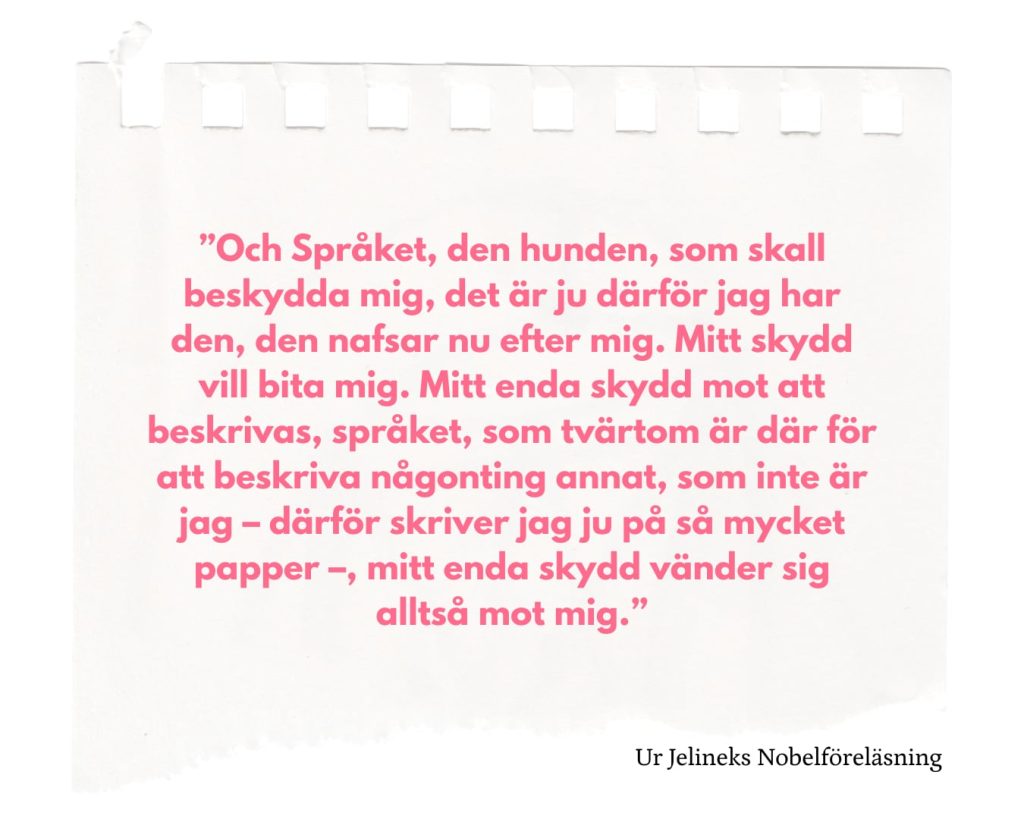 För att närma sig Jelineks dramatik får man även försöka att närma sig hennes historia, men kanske är det att göra henne orätt. Hon skriver med sin historia på kroppen men hon skriver aldrig sin historia. Det finns teman som ständigt återkommer i hennes författarskap: modersbindningen, männen, maktmissbruket, de perversa kvinnorna, men det är aldrig en privat röst som talar. Hon bär ett motstånd mot att vara den som beskriver och därmed också kan bli beskriven, en misstro mot själva språket. Paradoxen är således inskriven i Jelineks språk, i relationen till orden som både döljer och avslöjar. ”Vad är det för en maskering, som är till för att man inte blir osynlig, utan allt tydligare?” säger hon om språket i sin Nobelföreläsning.