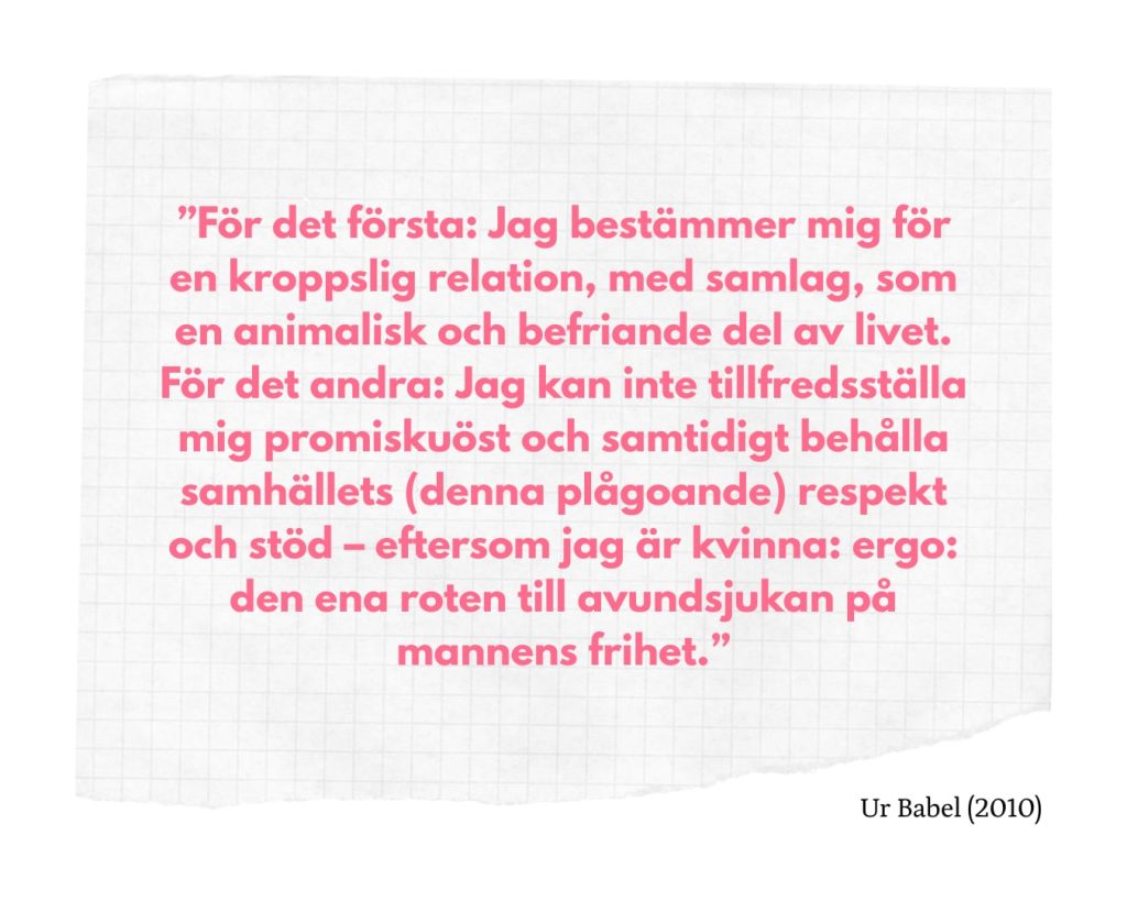 Detta leder mig tillbaka till Lugns inledningsfråga: “Varför finns det inga stora kvinnliga dramatiker?”. Frågan aktualiseras inte för att Jelinek kan förstås som ett undantag, utan för att hennes författarskap synliggör hur föreställningar om kön fortsätter att prägla möjligheten till erkännande. Sexualiteten, makten, könet är i ständig rörelse och undandrar sig därmed entydig placering; hon leker, utmanar och utforskar våra sociala myter. Språket blir platsen där alla identitetsmarkörer slutligen fallerar. Ofta framställs hon som “nischad” och “svår”, en inte ovanlig reception av kvinnliga författare som bryter normerna för det litteraturvetenskapligt etablerade. Absolut att hennes enorma textproduktion kan få henne att verka otillgänglig, men att framställa henne som “nischad” blir samtidigt ett hinder för bredare erkännande. Visst, det finns en galenskap hos henne, men ändå känns få författare mer passande för en galen och omoralisk samtid. Själva kategoriseringen “stor kvinnlig dramatiker” skulle antagligen Jelinek motstå sig, precis som alla andra liknande kategoriseringar.