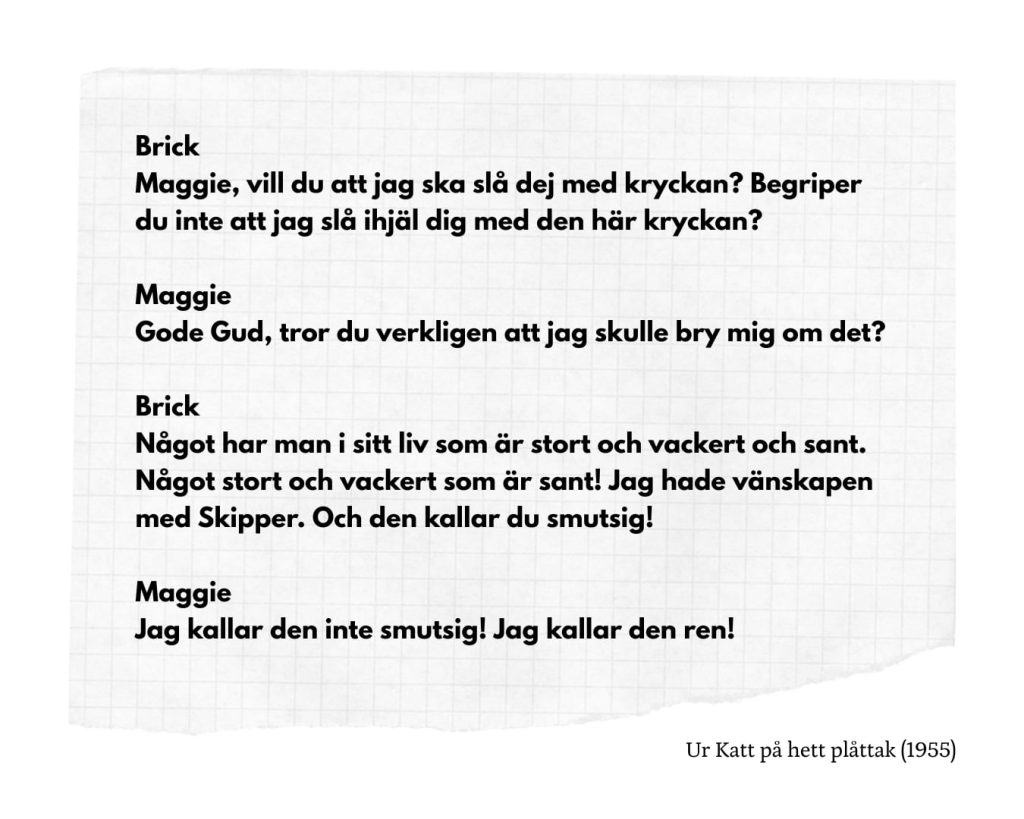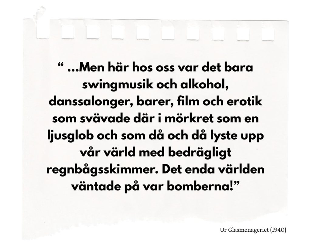 När världen brann riktade Williams pennan inåt, mot de mellanmänskliga relationerna och vår vilja att förgöra varandra på ett personligt plan snarare än ett globalt, men även vårt beroende av varandra. Karaktärerna ljuger ofta i Williams dramatik, men sällan för att illvilligt komma åt någon annan, utan snarare för att skydda dem, och framförallt skydda sig själva.