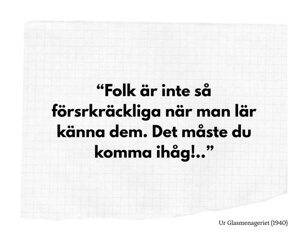 Och det finns många aspekter av Williams författarskap och persona som man skulle kunna välja att fördjupa sig i. Man skulle exempelvis kunna rikta fokus mot pojken Thomas vars tjocka accent från södern var så påtaglig att han redan på skolgården fick smeknamnet “Tennessee” – en pojke som slet ut sig i skofabriken på dagarna och skrev poesi om nätterna med drömmen om att bryta sig loss från sin moders överbeskyddande famn och sin faders knytnävsslag.