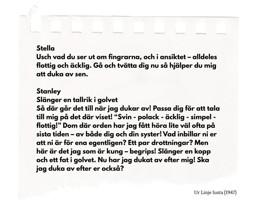 Den sexuella blicken mot mannens väsen och kropp är ofrånkomlig i all Williams dramatik och prosa. Själv var han en av de första öppet homosexuella dramatikerna på Broadway och Linje Lusta bröt ny mark med en homosexuell rollkaraktär i systerns Blanche man som ej visas, men vars självmord står som katalysator för hela intrigen. Trots att homosexalitet ej tilläts gestaltas (förbjudet på amerikansk teater till USA fram till 1968), var den ändå högst närvarande, en återkommande trop i Williams verk som ofta lät sina manliga karaktärer plågas bakom garderobsdörren.
