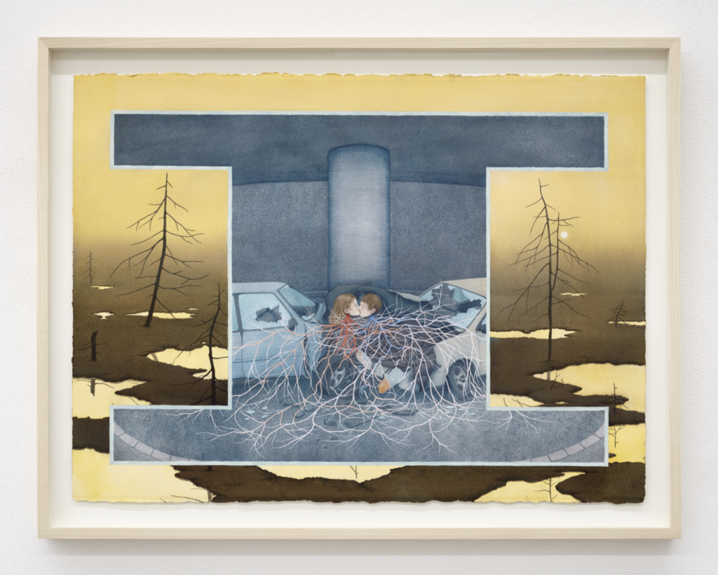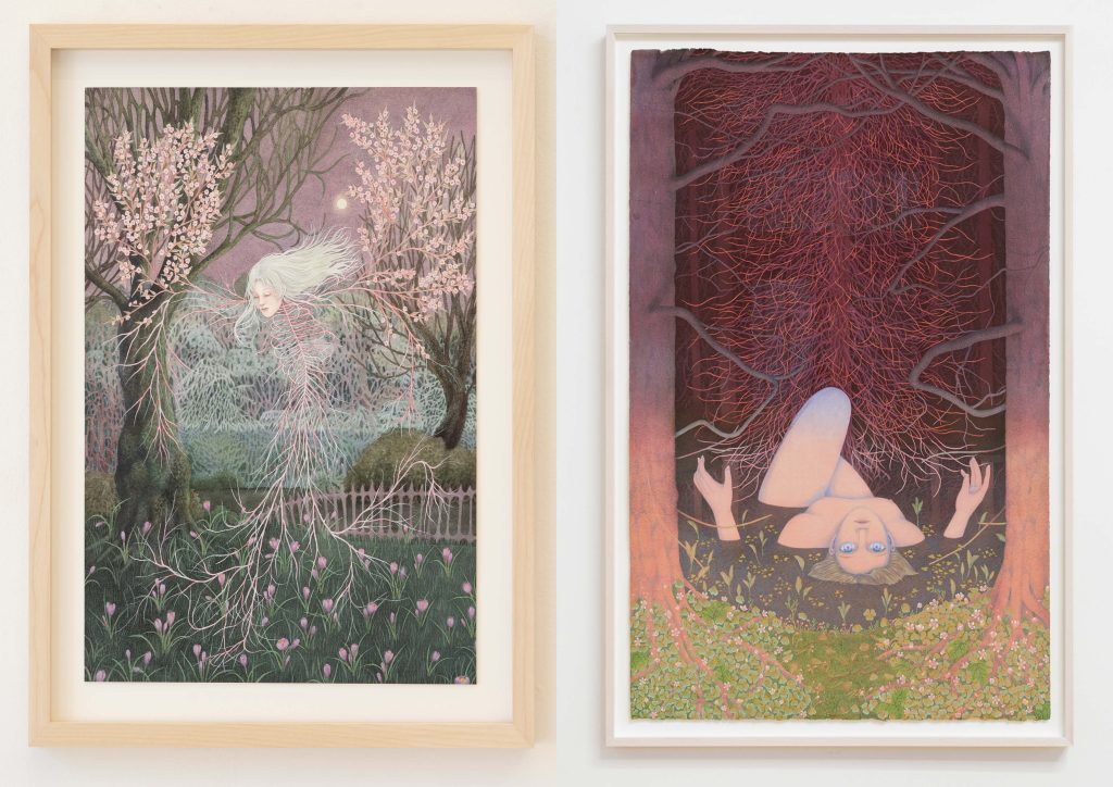 Jag minns inte första gången jag mötte Oda Sønderlands målningar. Det känns som om de alltid har funnits där, som fragment ur en dröm jag burit med mig. De påminner mig om skogen jag vandrade i som barn, där sagoväsen tycktes gömma sig i grenverken och bakom stammarna. Hennes bildspråk öppnar dörrar till en värld som är både skrämmande och vacker, där naturen inte är landskap utan närvaro, något som betraktar oss tillbaka. I hennes måleri löses gränsen mellan kropp och natur upp – armar och bröstkorgar slår ut i snårig växtlighet och rottrådar tränger in under huden. I det detaljerade akvarellmåleriet ryms en besjälad natur som, i sitt lilla format, lockar betraktaren att långsamt upptäcka en vidsträckt värld av hemligheter. Kanske finns laddningen just i glidningen mellan kroppen och landskapet – en påminnelse om att naturen inte är vår motsats, utan att den rör sig genom oss.