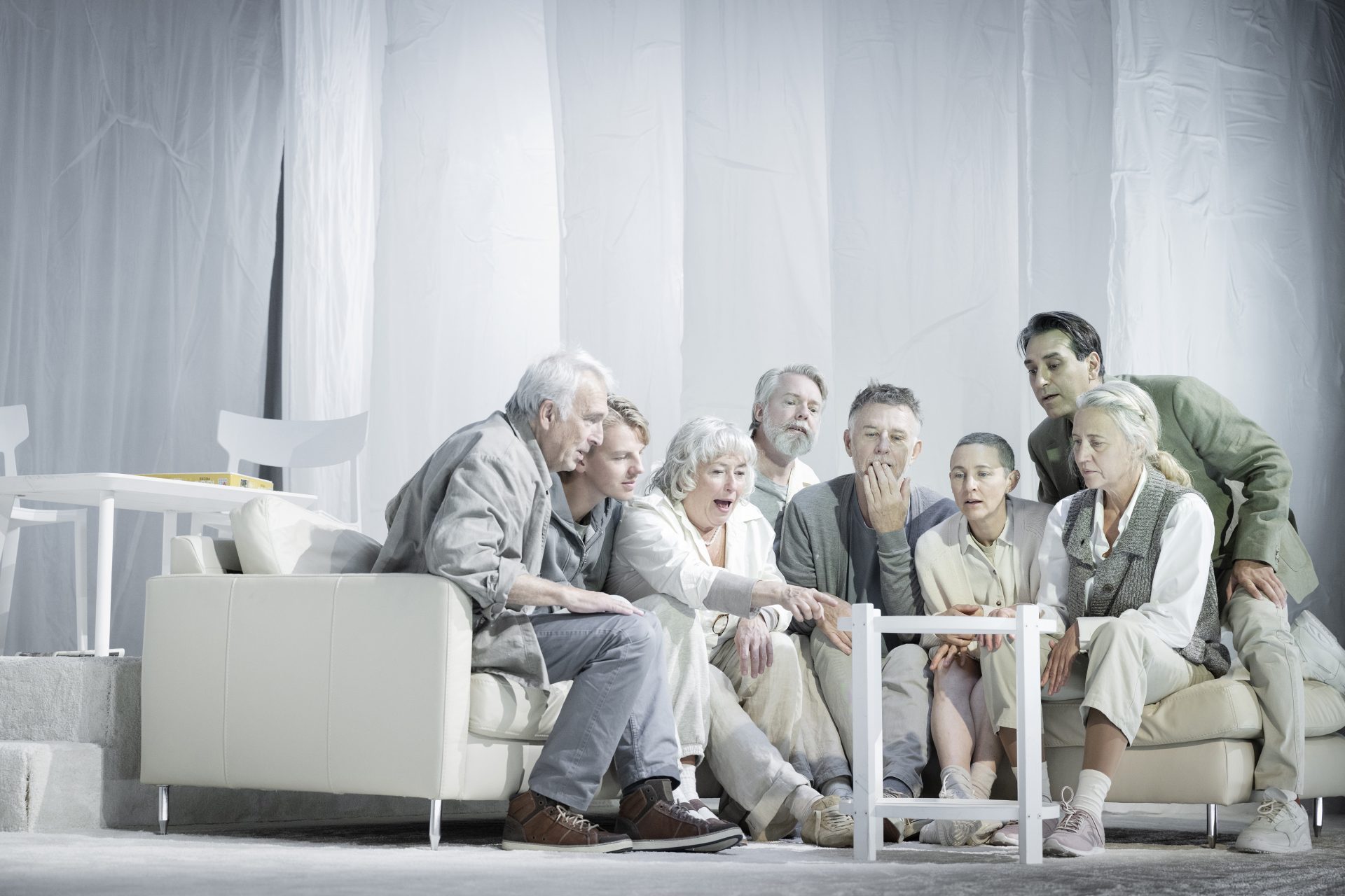 I det halvtråkiga, kliniskt vita grundljuset blir missmatchningen av scenografins färger tyvärr uppenbar. Här saknar föreställningen en aning stringens. Rummet gör sig bättre i den dämpade belysningen som inleder andra akten, en förkrossande scen där en av karaktärerna ligger hopkurad på sjukhusbädden och ser videos av sin dotter som är så oändligt avlägsen. Det är synd att ljusdesignern inte fått mer utrymme som i ovanstående scen. Projektionerna och det skrynkliga tyget framstår en aning billiga, som introt till en halvdålig sitcom från början av 2000-talet. Mot slutet framträder ansiktena från första scenen fram igen, nu i skärpa, och verkar förmedla nostalgi snarare än hopp. Här återvänder de; de saknade och de kvarlämnade. De vita tygen markerar en mjuk gräns mellan saknad och återförening, liv och död – ett rum som lämnar spår efter sig.