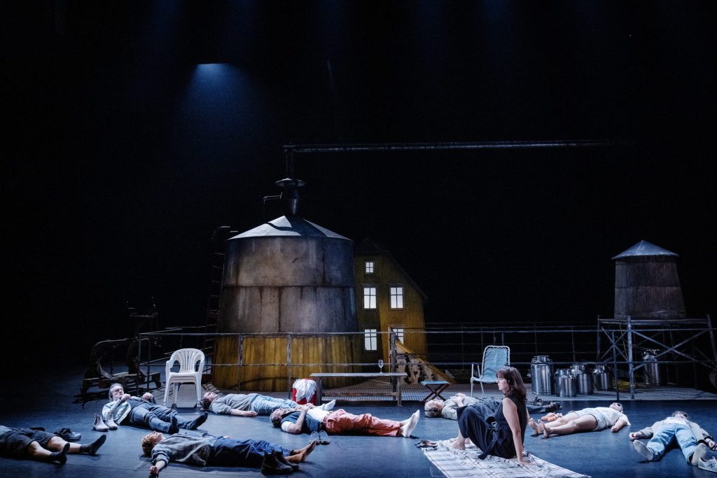Desto vassare blir denna Måsen när Ross regi låter samtalen stå i fokus, något som bidrar till ett finstämt samspel i ensemblen. Långa stunder av tystnad och skådespelarnas precisa leverans av dialog skalar bort omkringliggande frågetecken om tid och rum. En höjdpunkt är den unga aspirerande skådespelerskan Ninas (Nora Sadayo) monolog i Augusts immersiva hörlurs-pjäs. Ensemblen ligger utspridd på scengolvet som stjärnor på en natthimmel och bär tillsammans monologen genom att fylla i varandras meningar. ”Människor, lejon, örnar, rapphöns.” I slutscenen delar de återigen på Ninas monolog mellan symmetriskt utplacerade mjölkkannor – precis där de själva legat för två timmar sedan. Samtidigt tar August sitt liv, hans konst har inte längre något syfte. Självmordet blir ett koreografiskt flimmer där hela ensemblen med ökad intensitet förkroppsligar det djuriska i människan.