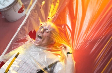 Pjäsen inleds med att två män i tystnad täcker scengolvet med plast. Ett inplastat golv, helt perfekt och utan glipor innebär för mig total tillfredsställelse, så döm om min besvikelse när en bit ej viks ut. Maktlös tänker jag att det där får jag göra själv när jag kommer hem. Oavsett är uppmärksamheten total och förutsättningarna perfekta för att starta föreställningen.
