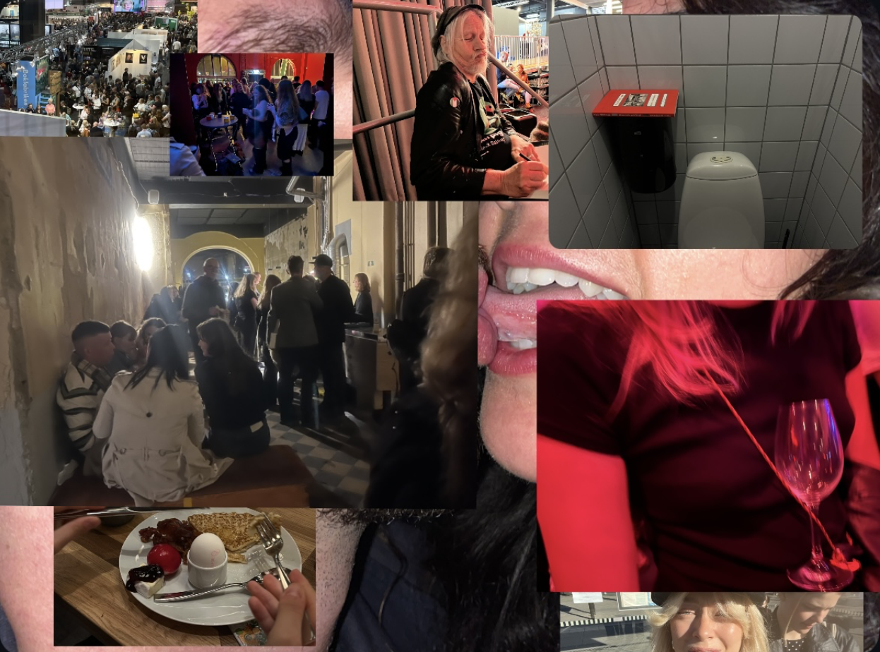 01:30 Marit Kapla står och hänger. Lydia Sandgren röker typ jättemkt? Någon häller ner en ljummen öl i mitt glas. Någon säger att hon hatar Beyond Retro i GBG och jag blir kränkt. Tänker på tidigare under dagen när Agri Ismail sa att 50% av hans pressbilder fick kasseras för att hans hund hade stånd. Får liksom inte den bilden ur huvudet? Ett rosa styft hundstånd penetrerar min skalle.